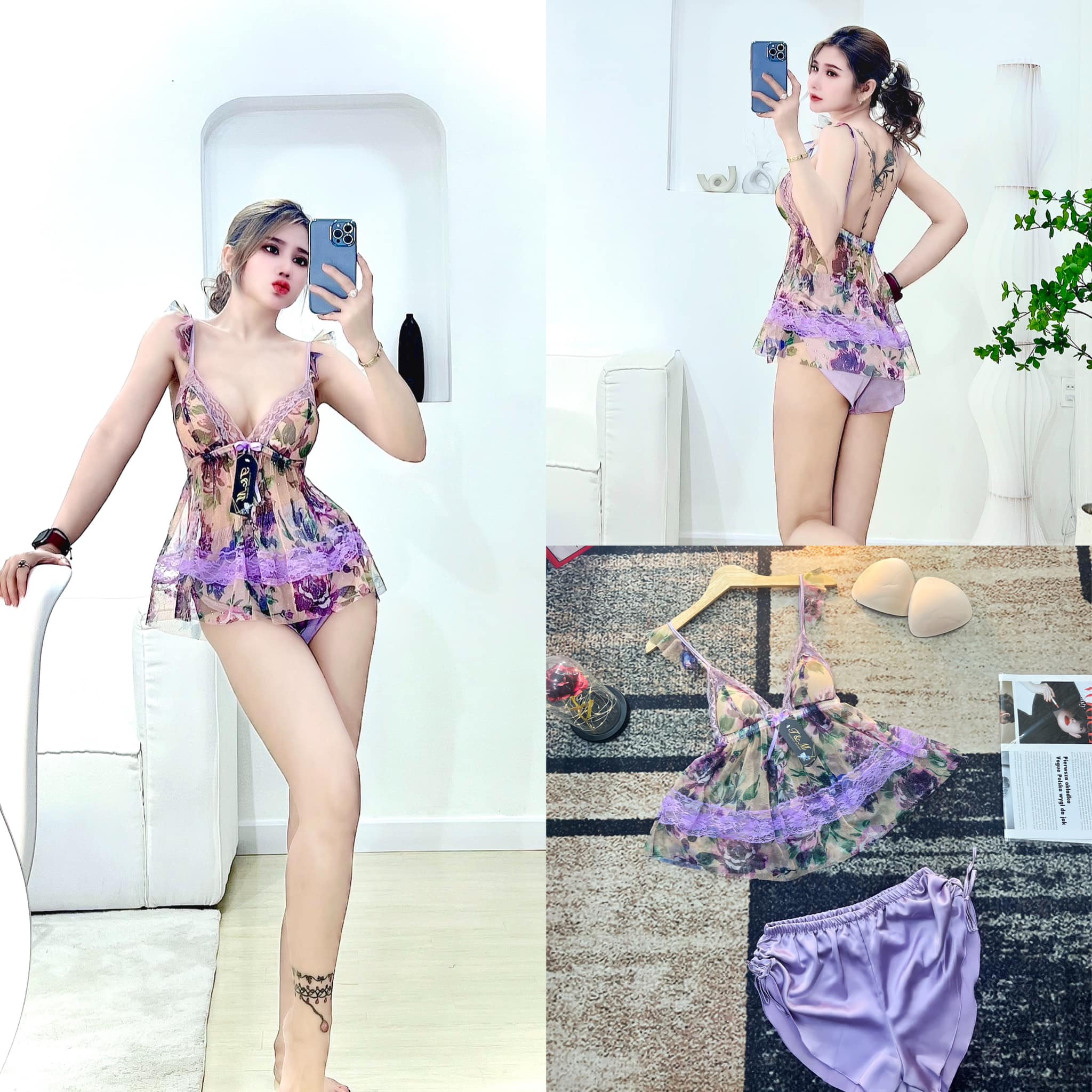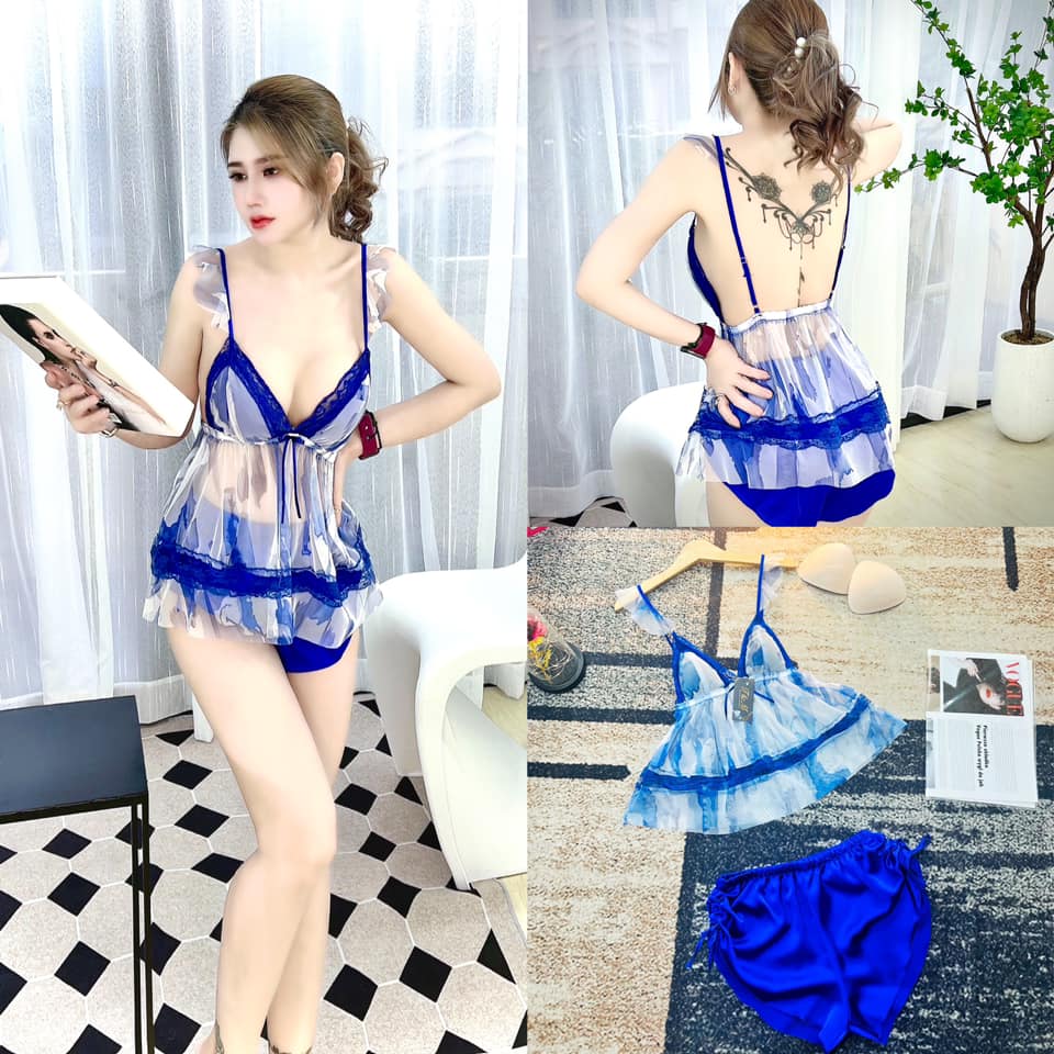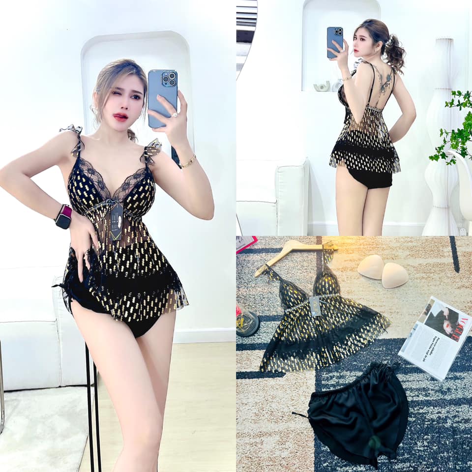 Bộ đồ ngủ áo lưới mềm - Quần Satin chất vải tốt có mút rời, tăng kim loại được thiết kế riêng bởi Mi Sleepwear chất lượng và giá rẻ